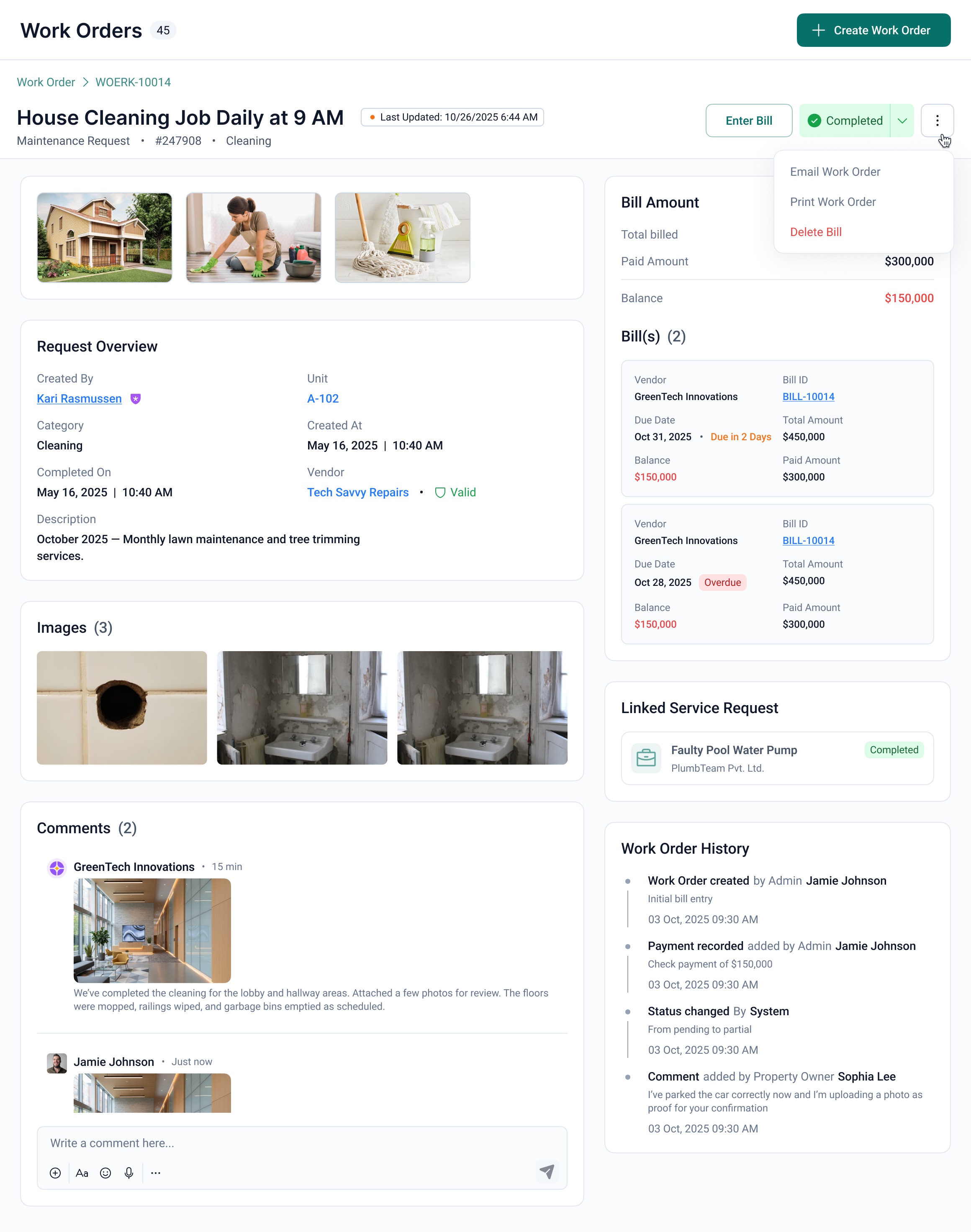 Before, during, and after photos attached to every work order. Visual proof of work completed.